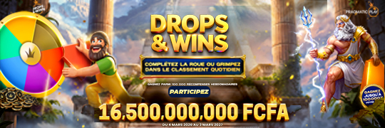 - Les Drops hebdomadaires de la roue Drops & Wins sont disponibles dans certains jeux de machines à sous du 4 mars 2026 à 18h01 GMT+0 (19h01 CET) jusqu'au 3 mars 2027 à 17h59 GMT+0 (18h59 CET), du mercredi au mercredi suivant (la « Durée Promotionnelle »). Il s'agit d'une promotion à l'échelle du réseau gérée par Pragmatic Play, avec des cagnottes partagées entre plusieurs opérateurs participants.